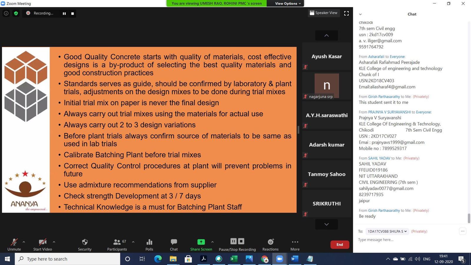 Rohini PMC in association with Empower Ananya has been conducting a series of training sessions for Civil Engg students across India.